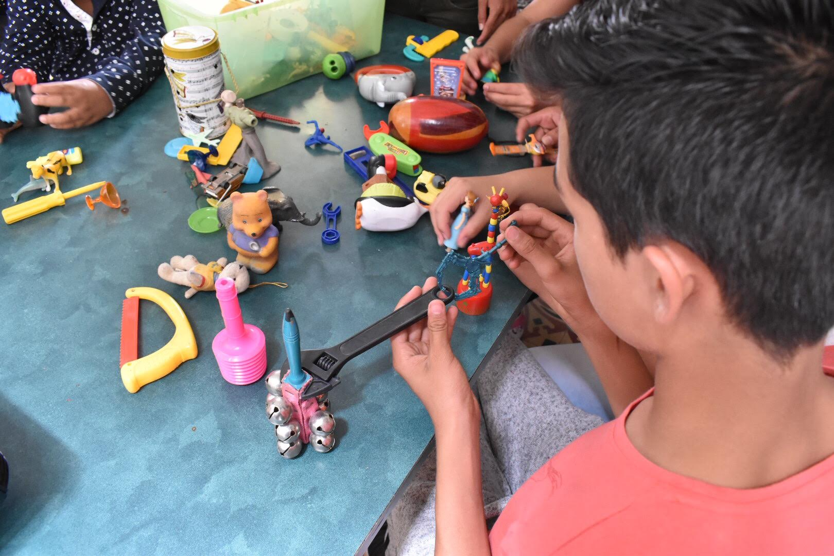 An image showing a several students constructing a small sculpture made of toys on a table top.